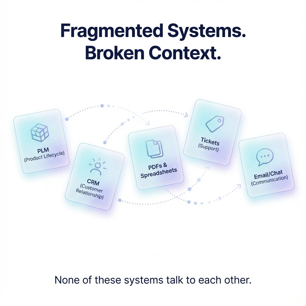 Reconstruct complete context across engineering, sales, compliance, and supply chain systems so AI can execute industrial workflows without risk, rework, or guesswork.